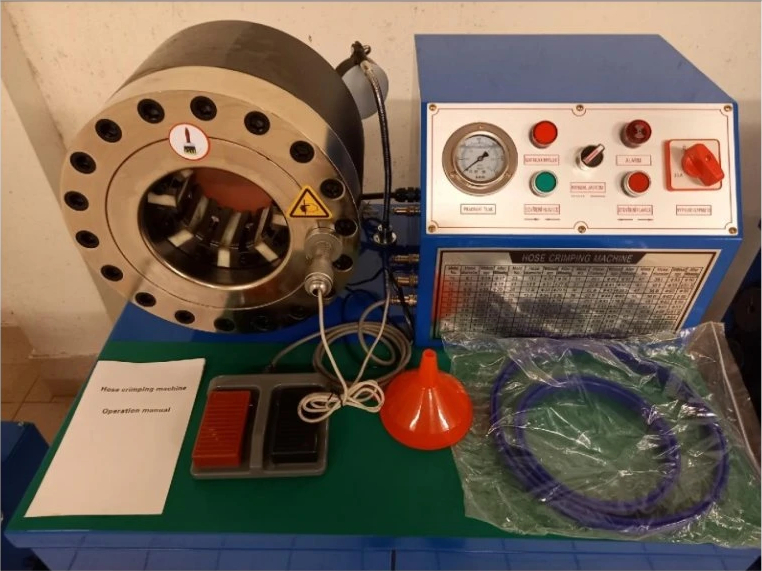 Pracovní síla 600T, určený pro lisování hadic v průměru 15-63 mm. Součástí stroje lisovací čelisti 10ks, nožní pedál, zadní doraz nastavitelný, přední doraz mikrometr s přesností 0,01 mm, nálevka na olej, magnetická posuvná lampa.